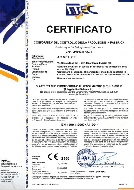 AR.MET. ha ottenuto la certificazione per la realizzazione di componenti strutturali in acciaio in classe di esecuzione EXC3 (ed inferiori) per i gruppi di acciaio 1.1, 1.2 e 1.4 (classificazione UNI CE ISO/TR 15608) e grado di acciaio da S235 a S355 (EN 10025).